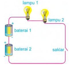 Arus listrik mengalir tanpa melalui cabang. Arus listrik yang mengalir melalui lampu 1 melalui lampu 2, demikian pula yang melalui baterai 1 dan baterai 2.