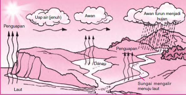 - Uap air yang suhunya turun akan berubah menjadi air. Air ini akan berkumpul di angkasa kemudian turun menjadi ….