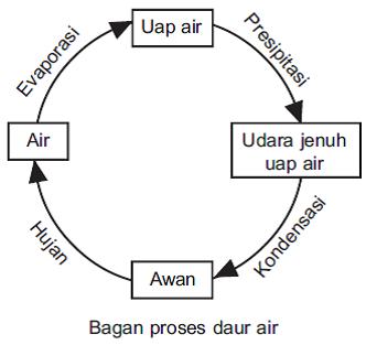 - Daur air dimulai dari menguapnya air dari berbagai sumber seperti danau, laut, sungai dan penguapan tumbuhan karena panas dari sinar matahari. Uap air naik dan berkumpul di udara. Lama-kelamaan udara tidak dapat lagi menampung uap air (jenuh). Jika suhu uap air turun, uap air ini akan berubah menjadi titik-titik air (mengembun). Titik-titik air ini membentuk awan. Titik-titik air ini kemudian turun menjadi hujan.